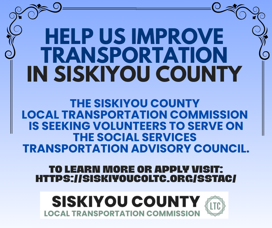 The Siskiyou County Local Transportation Commission (LTC) is seeking community members to serve on the Social Services Transportation Advisory Council (SSTAC).